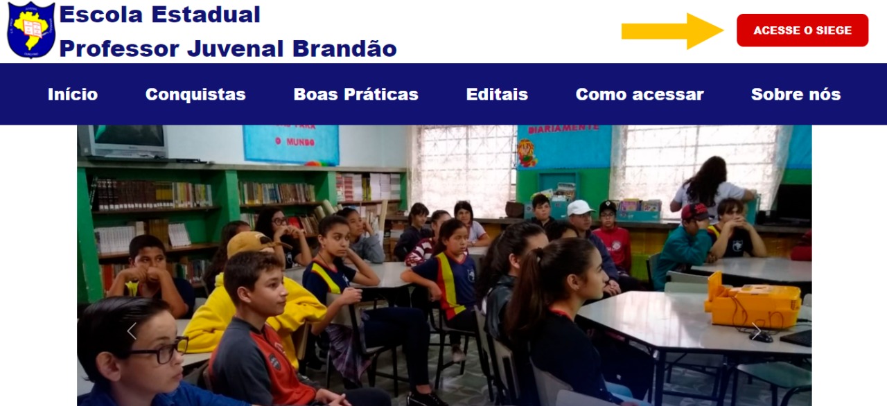 Passo 1: Ao acessar o site da escola, clique no botão vermelho "ACESSE O SIEGE", localizado no canto superior direito da página.