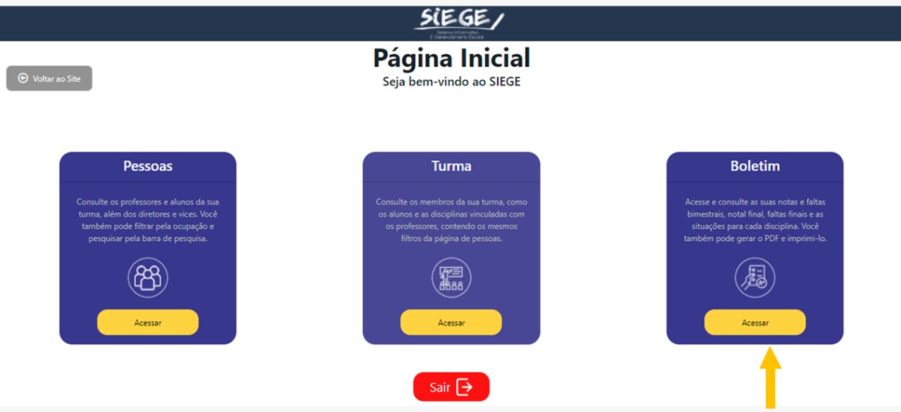 Passo 3: Acessando o sistema, clique no botão amarelo "Acessar", no bloco azul "Boletim".
