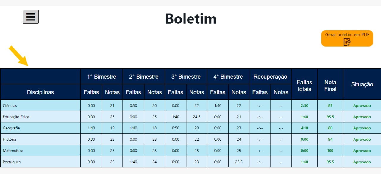 Passo 4.1: Pronto! Você já pode visualizar as notas e faltas. (Nesta foto, foram utilizadas notas e faltas inventadas para exemplificar o boletim de um aluno).