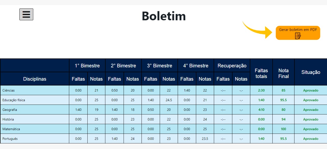 Passo 4.2: Caso você queira visualizar e/ou imprimir o boletim em PDF, basta clicar no botão laranja "Gerar boletim em PDF".