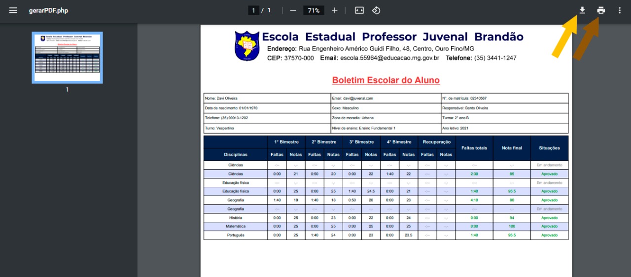 Passo 4.3: Para baixar o boletim em PDF, basta clicar no botão indicado na imagem pela seta dourada e, para imprimi-lo, clique no botão indicado pela seta marrom. (Como na imagem utilizada no passo 4.1, o nome, os dados e todas as informações expostas são totalmente inventadas).